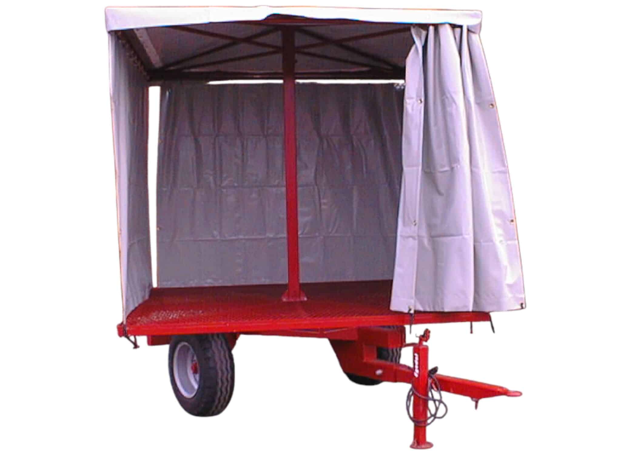 A wagon with a rotating platform for transporting plants. Holds up to 4 containers. Includes adjustable tarp cover. Compatible with Liftmaster, RO, and NG plant lifters.