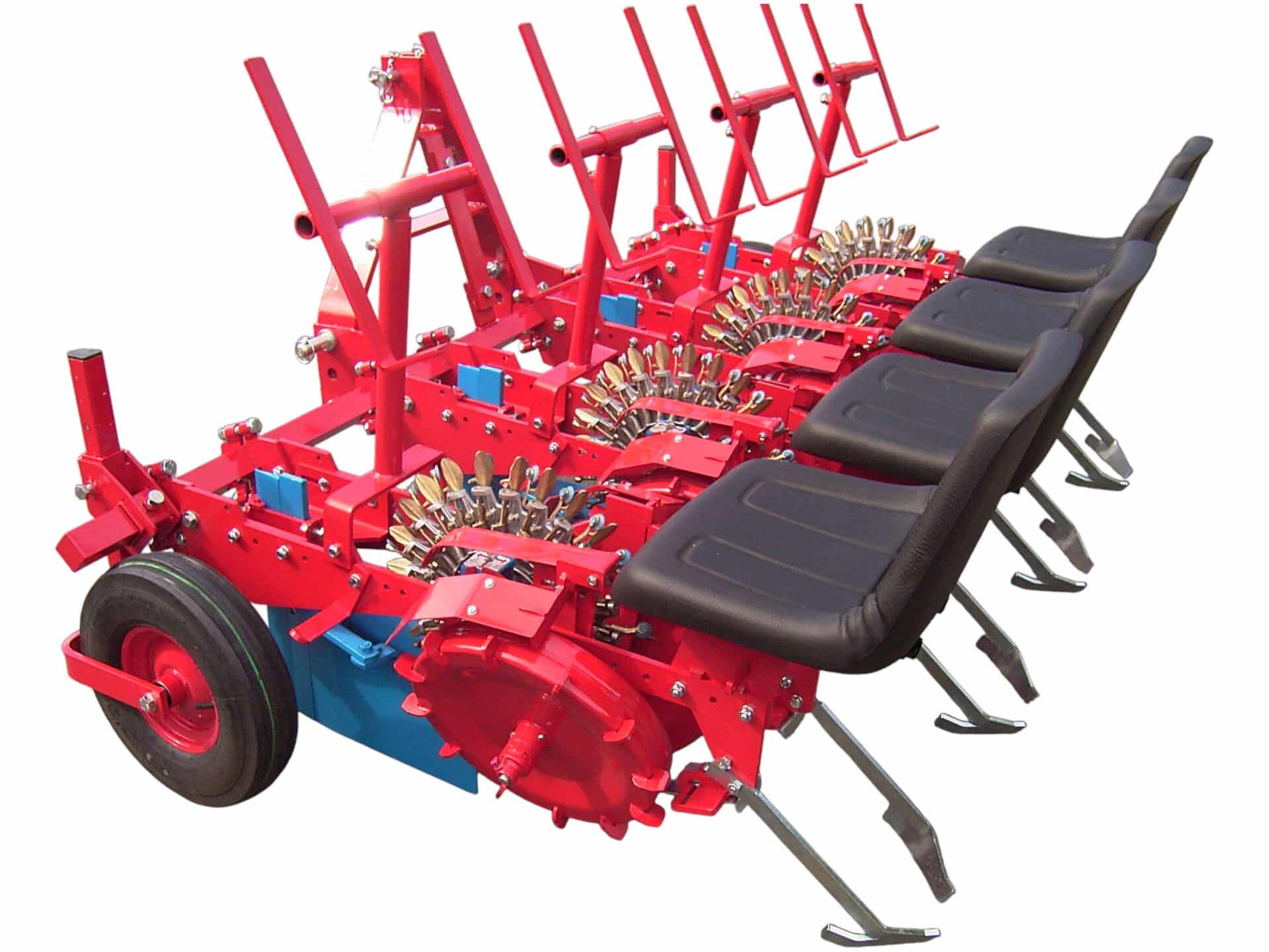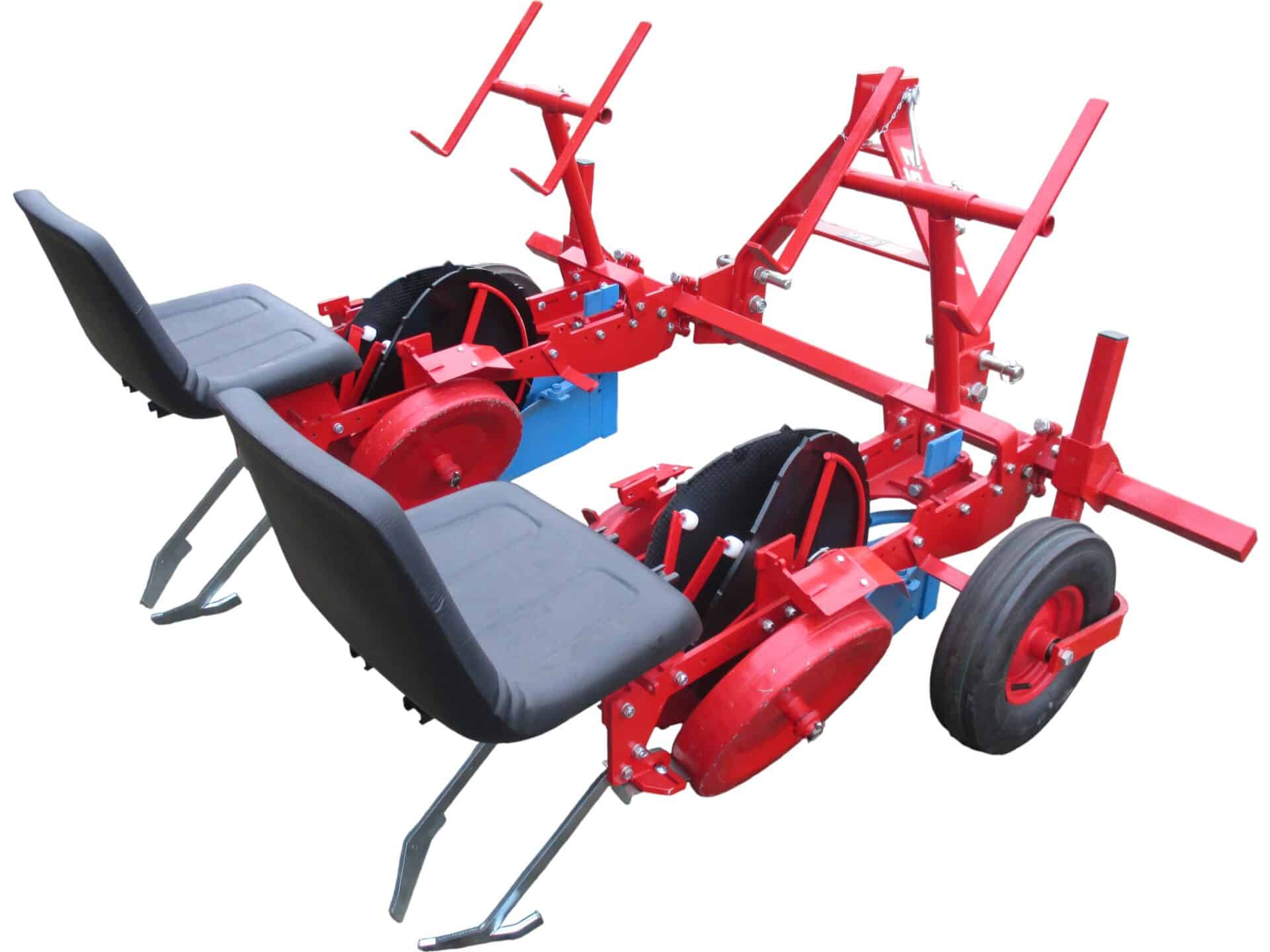 The transplanter includes pressure wheels to maintain correct planting pressure and a seat to provide a comfortable working position for the operator, reducing fatigue and increasing productivity during the planting process.