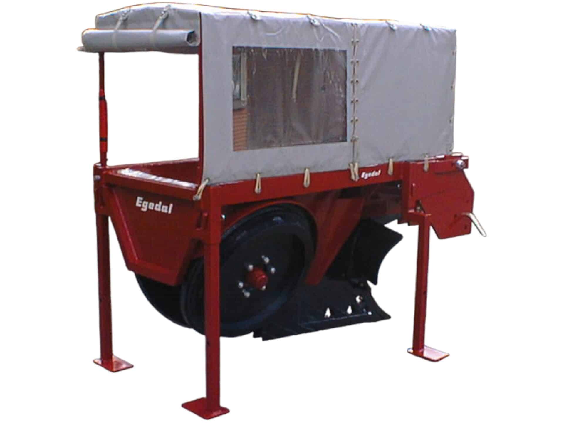 The operator is securely positioned between the wheels, protected by durable shields, while the canopy provides shelter from rain and sun for both plants and operator. This feature allows for planting in all weather conditions, enhancing operator comfort.